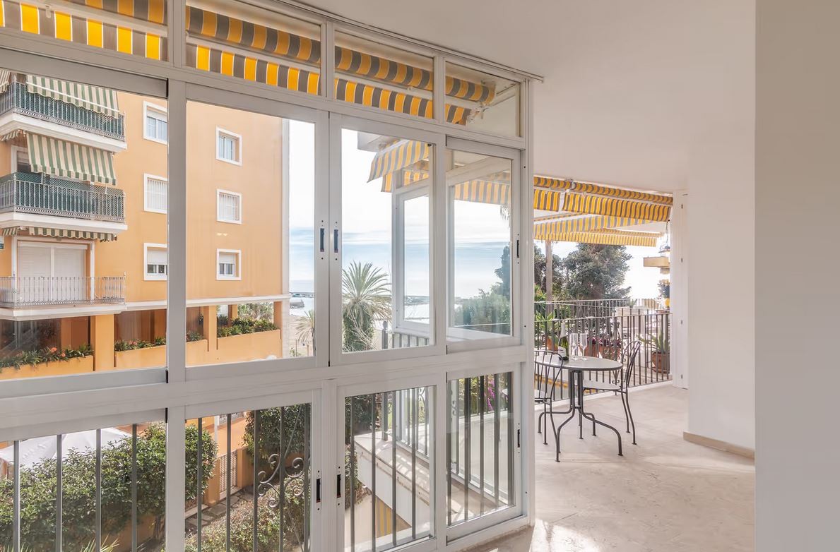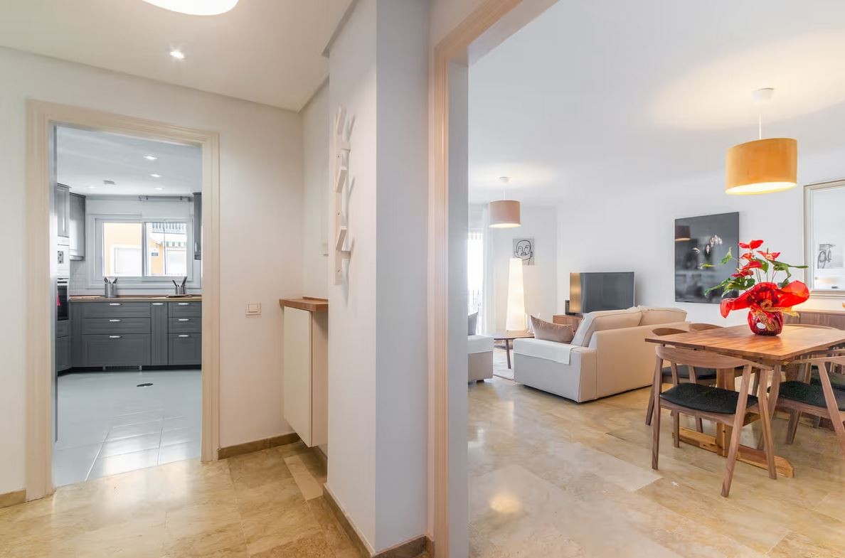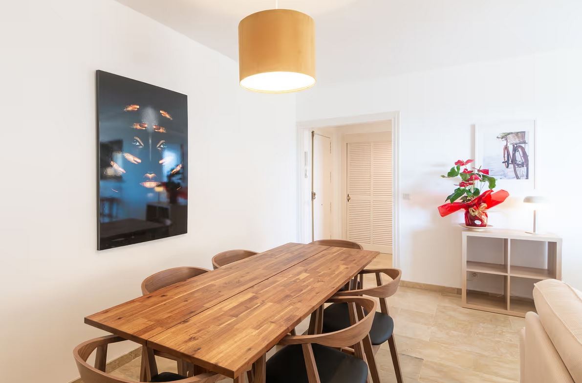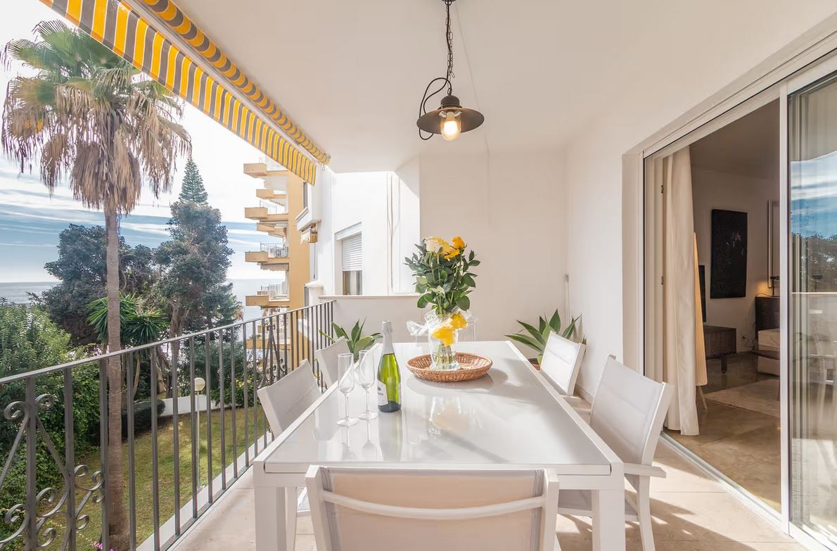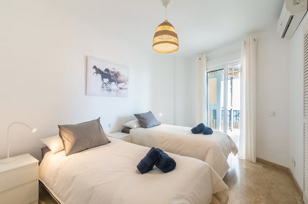 The apartment is located in Marbella and overlooks the Mediterranean Sea. The six-story property comprises a living room, a fully equipped kitchen, three bedrooms, and two bathrooms. Additional amenities include high-speed Wi-Fi (suitable for video calls) with a dedicated workspace for video calls, a smart TV with streaming services, air conditioning, a fan, a washing machine, and a dryer. A cot and highchair are also provided.
