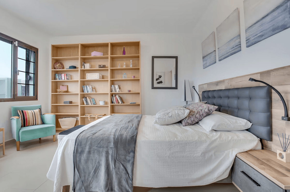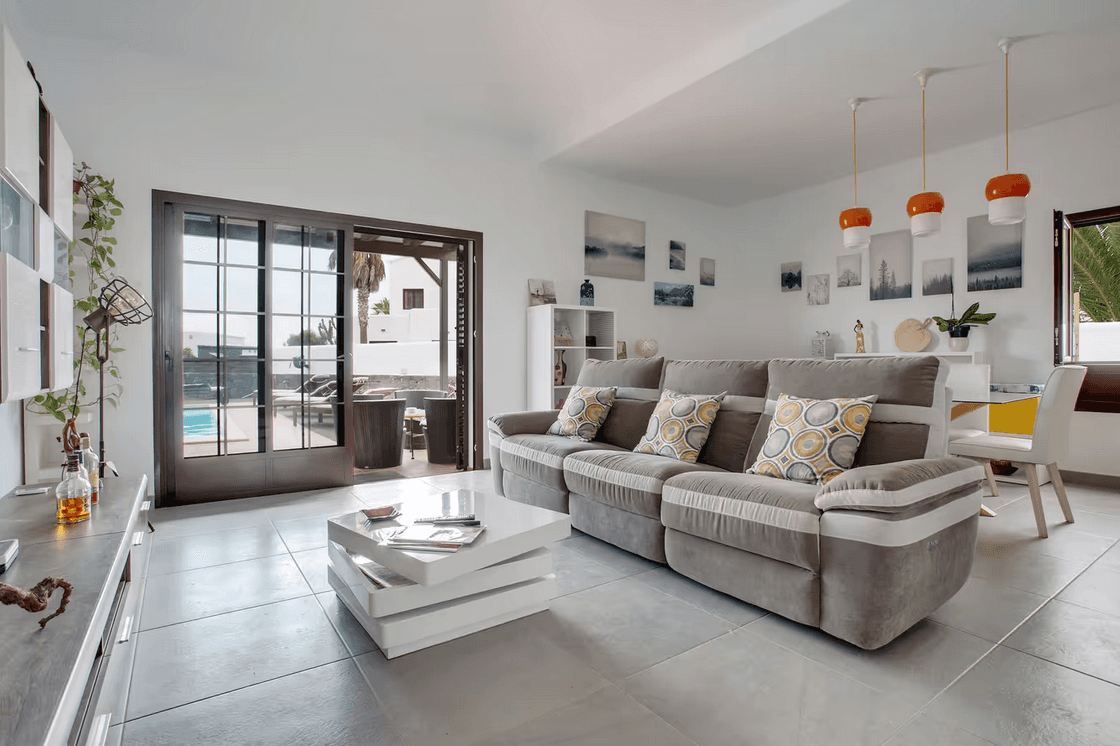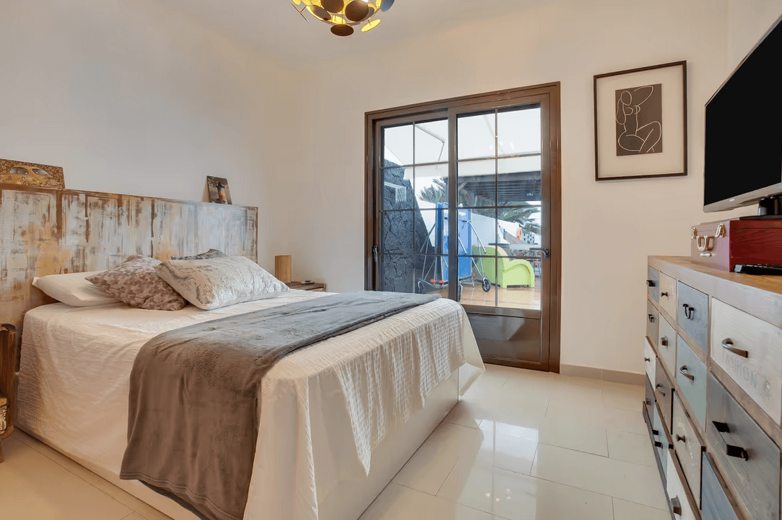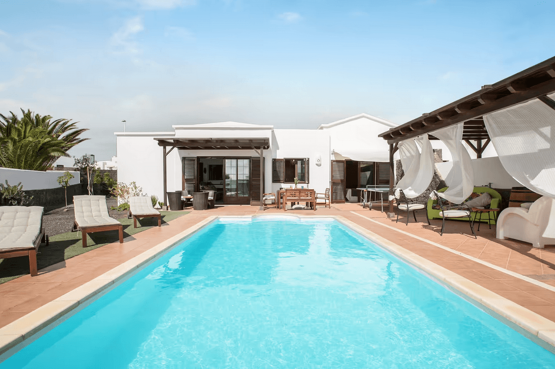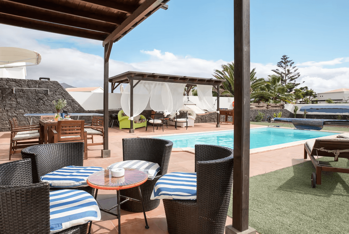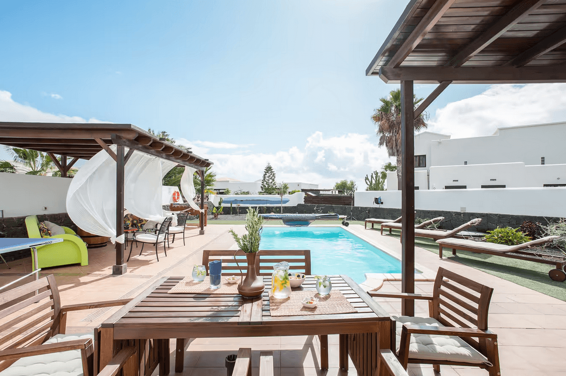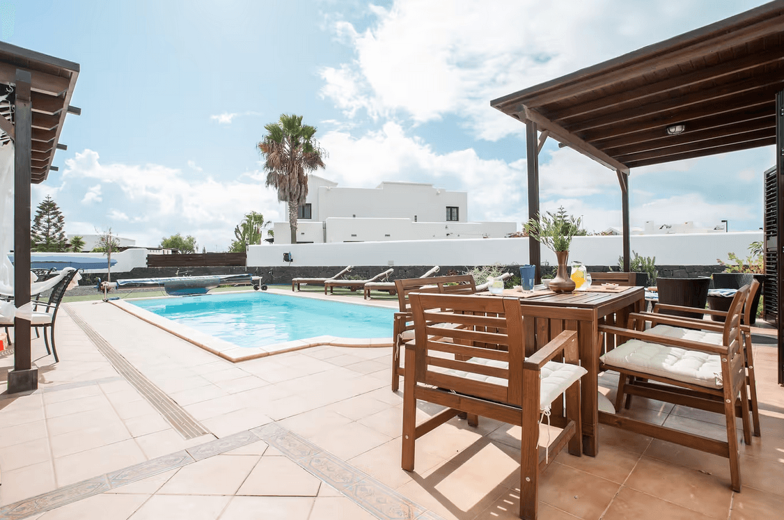 Located in Playa Blanca, this house has everything you need. The spacious home offers sea and mountain views and comprises a living/dining room, a well-equipped kitchen with a dishwasher, a library, three bedrooms (one with two single beds), and two bathrooms. The property can comfortably accommodate six people. Additional amenities include high-speed fiber optic internet, a washing machine, fans, and a television with a wide selection of sports channels and Netflix. A ping-pong table and foosball table are also available. The private outdoor area features a garden, terraces (both open and covered), a barbecue, a swimming pool, and an outdoor shower. The multiple outdoor seating areas invite you to relax in the sun while engrossed in a good book, and the pool provides a refreshing escape on hot days.